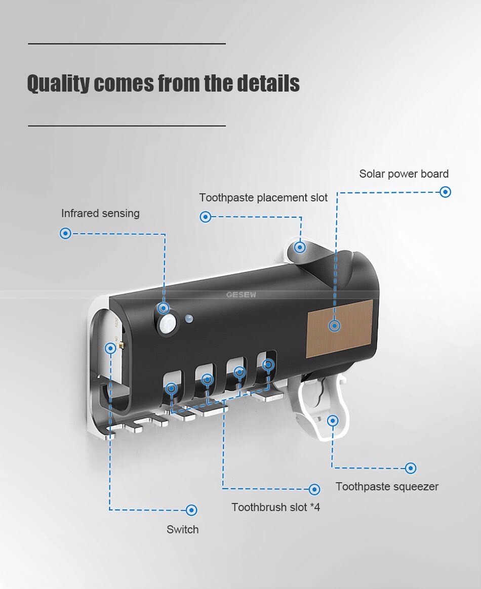 The toothbrush sterilizer includes a toothbrush holder, toothpaste dispenser, and toothbrush UV sterilizer.